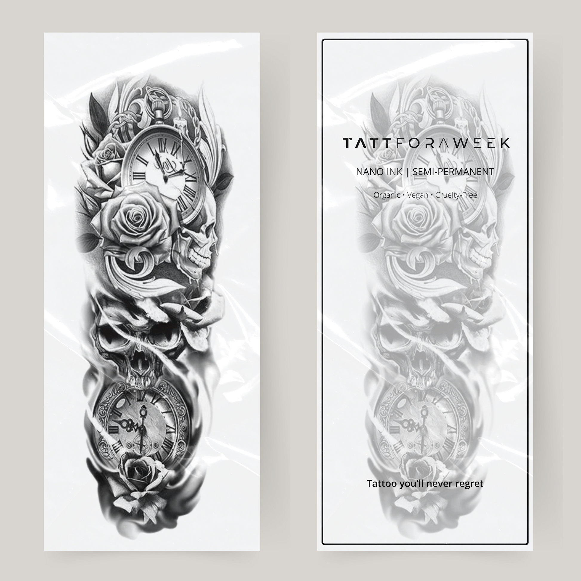 Falska tatueringsärmar rosor, dödskallar & klockor
